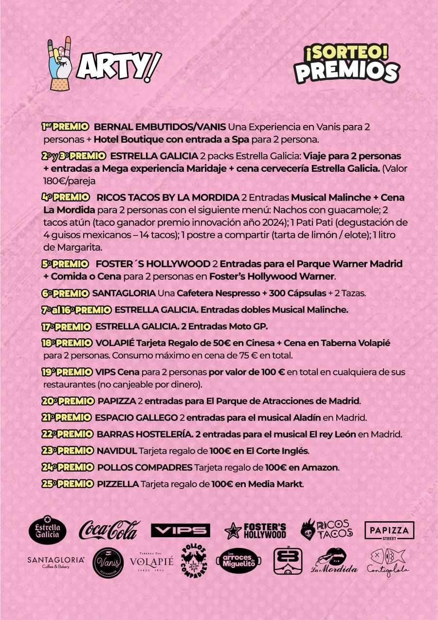 Por cada 10€ de consumo en barras/hostelería (Vips, Foster´s Hollywood, Papizza, Taberna Volapié, Ricos Tacos by La Mordida, Santagloria, Bernal Embutidos Vanis, Espacio Gallego, Barras, Pollos Compadres, Pizzella, Navidul, Estrella de Galicia) dentro del recinto Arty!World, se hará entrega de un rasca y gana, con un código para registrar en la web http://www.artyworld.es y así acceder al sorteo de 25 premios.